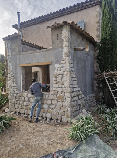 Réalisation d’un chantier façade à Cotignac comprenant la pose de parement en pierre naturelle et l’application d’un enduit de finition. Intervention destinée à valoriser l’esthétique du bâtiment tout en renforçant la protection des murs extérieurs.