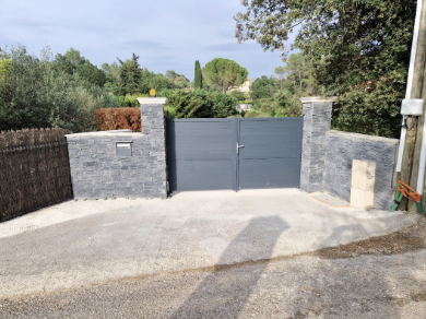 - Travaux réalisés: Façade, pose de parement sur mur et pilier portail.