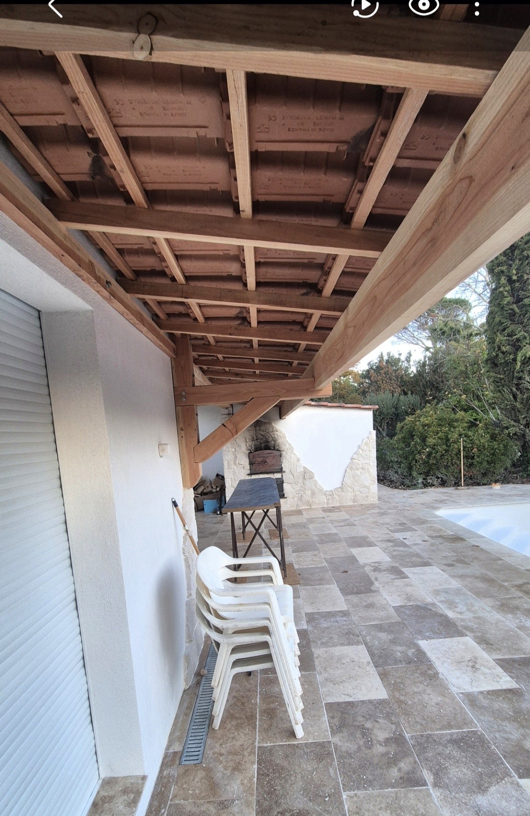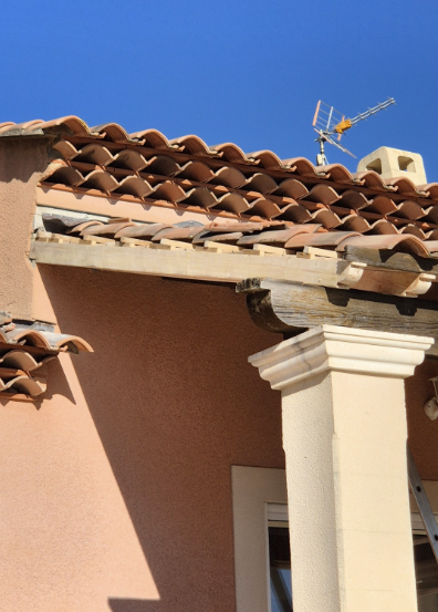 Réalisation sur mesure avancée de toit en bois Douglas avec tuiles romanes